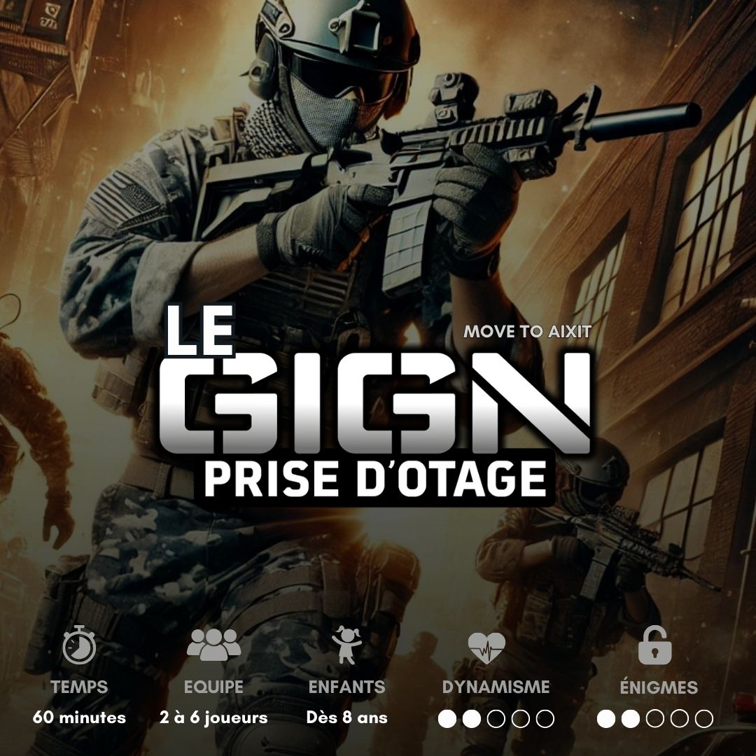 Le GIGN : cette salle n’est pas conçue pour faire peur et n’est pas violente. Elle est plus tournée vers le thème enquête et mystère (scénario d’une prise d’otage) avec une petite touche d’adrénaline. Celle-ci peut être jouée par des enfants.